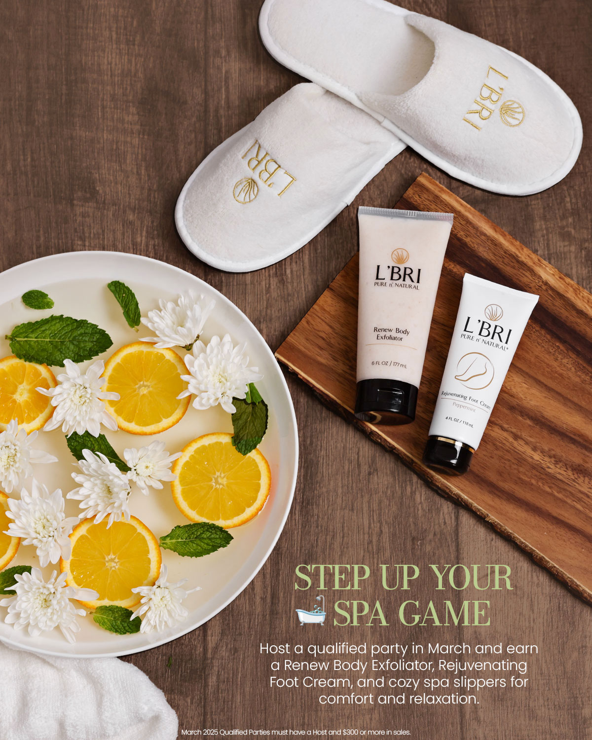 Host a qualified party in March and earn a Renew Body Exfoliator to slough away dead skin and reveal your natural radiance, Rejuvenating Foot Cream to deeply moisturize and rejuvenate tired feet, and cozy spa slippers for comfort and relaxation. A $47 value.